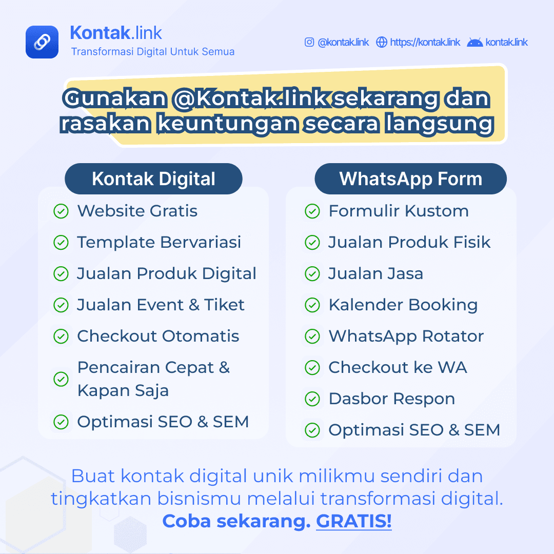 Kontak.link adalah produk Tangga Digital Studio (TDS) dan sebuah platform digital yang memungkinkan kamu membuat kontak digital unik milikmu sendiri dan meningkatkan bisnismu melalui transformasi digital.