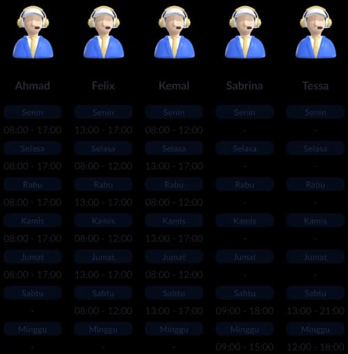 Ada 5 Customer Service (CS) untuk membantu operasional bisnis kamu dengan beberapa jadwal berbeda seperti ilustrasi pada gambar. Beberapa skenario yang mungkin dilakukan berkaitan dengan hal tersebut adalah: